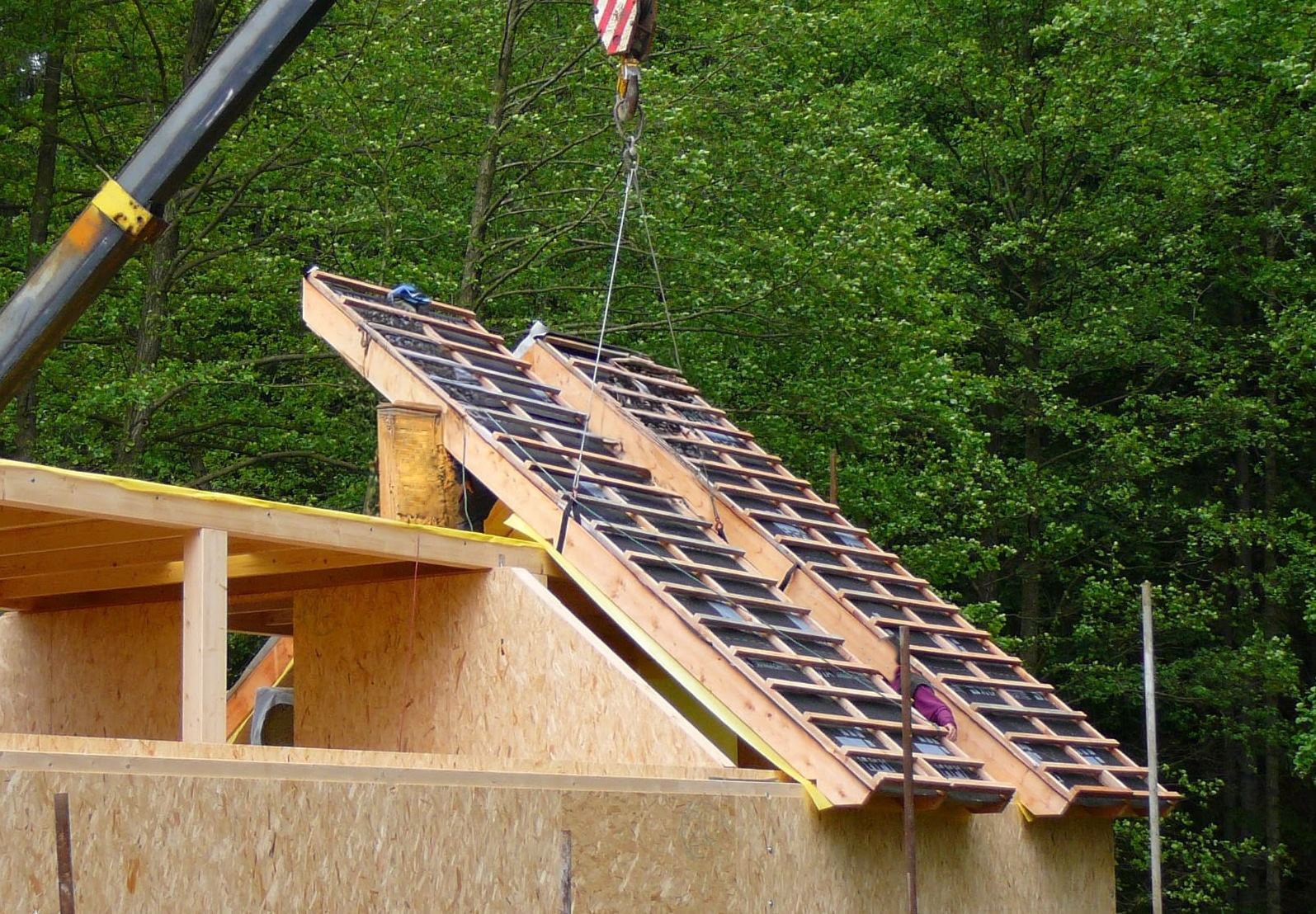 Auf der Baustelle, nach fertigstellung der Bodenplatte mit den entsprechenden Anschlüssen der einzelnen Versorgungsleitungen (Kanal, Wasser, Strom, Gas) vorbereitet. Der Gebäudeteil über dem Fundament wird auf der Baustelle aus werkseitig gefertigten Elementen mit einem Kran montiert. Das Grundgerüst hat einen verzinkten Stahlkern, was dem Fertighaus eine einzigartige statische Freiheit gibt. Dieser Prozess dauert einige Tage, danach folgt die Dacheindeckung und Sie dürfen Ihr Werk selbst mit Ihren Handwerkern vollenden.